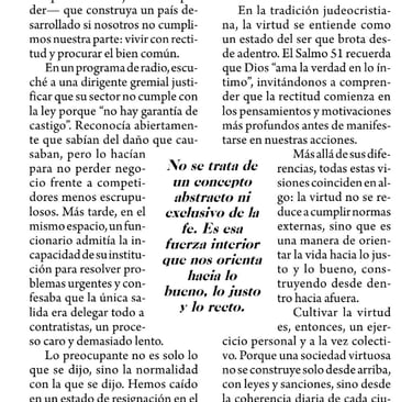 Cultivar la virtud es, entonces, un ejercicio personal y a la vez colectivo. Porque una sociedad virtuosa no se construye solo desde arriba, con leyes y sanciones, sino desde la coherencia diaria de cada ciudadano: respetar una norma aunque nadie mire, no sobornar, no mentir, no aprovecharse de la ingenuidad del otro, contribuir con lo que nos toca, tender puentes en vez de muros.