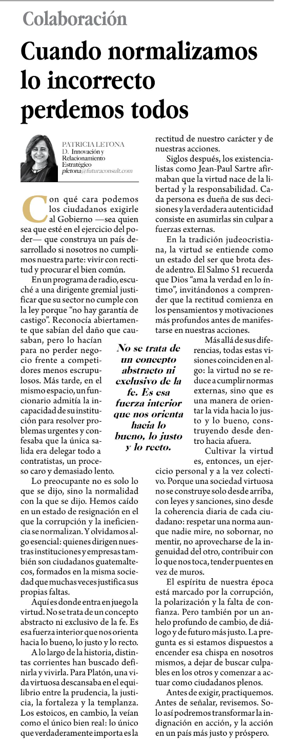 Lo preocupante no es solo lo que se dijo, sino la normalidad con la que se dijo. Hemos caído en un estado de resignación en el que la corrupción y la ineficiencia se normalizan. Y olvidamos algo esencial: quienes dirigen nuestras instituciones y empresas también son ciudadanos guatemaltecos, formados en la misma sociedad que muchas veces justifica sus propias faltas.