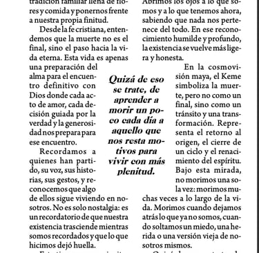 Recordamos a quienes han partido, su voz, sus historias, sus gestos, y reconocemos que algo de ellos sigue viviendo en nosotros. No es solo nostalgia: es un recordatorio de que nuestra existencia trasciende mientras somos recordados y que lo que hicimos dejó huella.