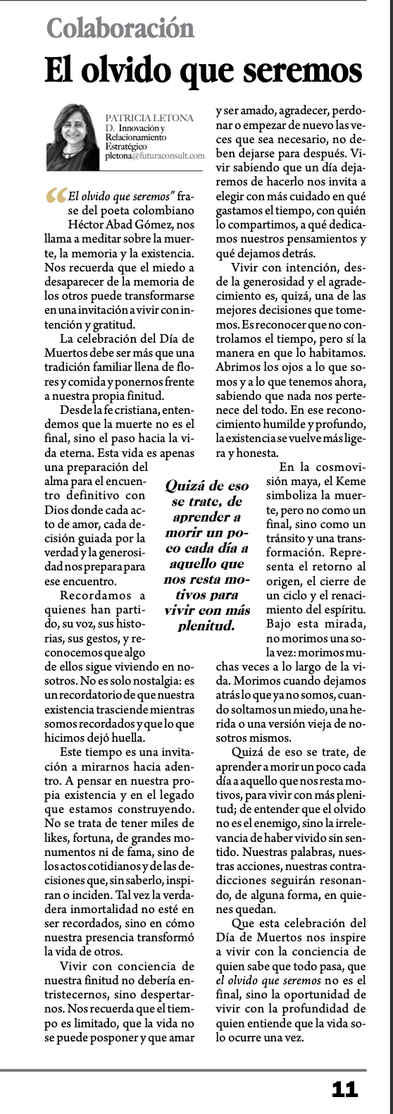 Que esta celebración del Día de Muertos nos inspire a vivir con la conciencia de quien sabe que todo pasa, que el olvido que seremos no es el final, sino la oportunidad de vivir con la profundidad de quien entiende que la vida solo ocurre una vez.